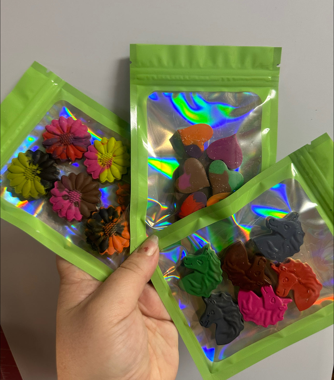Made to order - colors at random. 6 crayons per pack , mystery shape - so many themes not shown